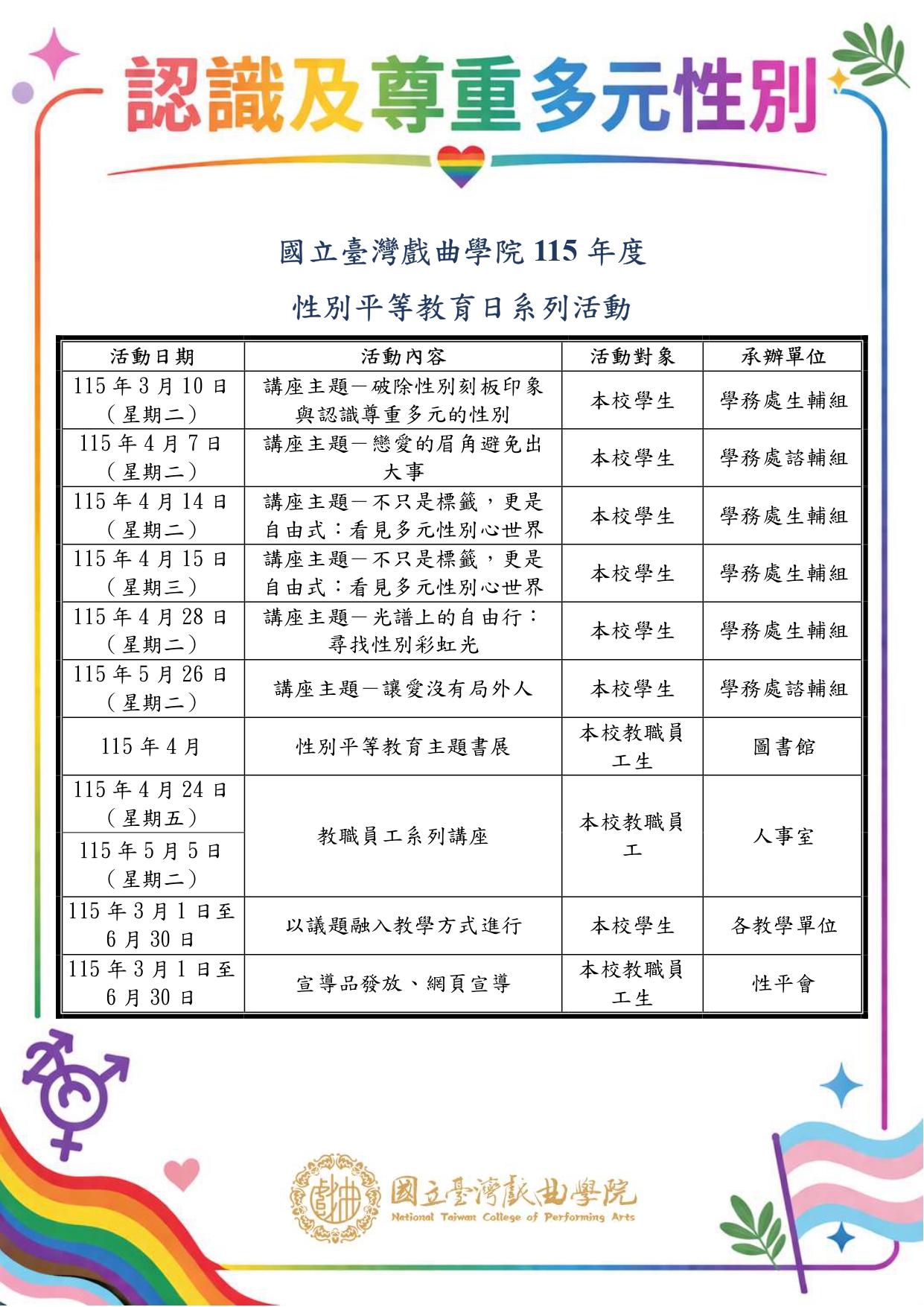 本校420性別平等教育日系列活動-認識及尊重多元性別,歡迎踴躍參加!